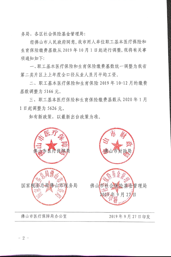 佛山市醫療保障局 佛山市財政局 國家稅務總局佛山市稅務局 佛山市社會保險基金管理局關于調整我市用人單位職工基本醫療保險和生育保險繳費基數的通知佛醫保【2019】96號