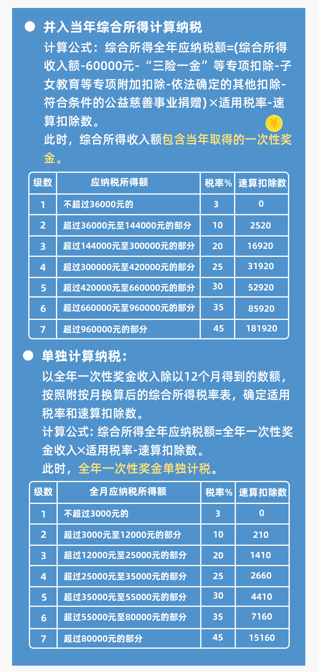 春節將至,很多小伙伴都收到了年終獎。根據現行政策,居民個人取得的全年一次性獎金有兩種計稅方法可供選擇。究竟哪種計稅方法更劃算呢?一起來看!